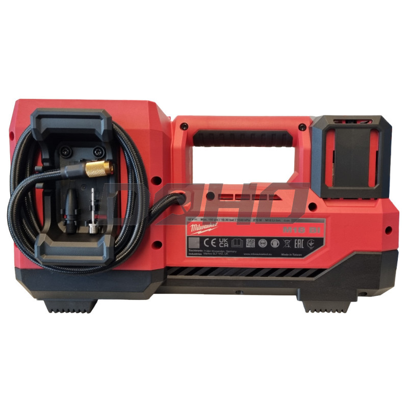 Milwaukee M18 BI-0 ir kompakts un viegls akumulatora kompresors, piemērots automašīnu, vieglo kravas auto un iekārtu riepu ātrai uzpildei. Maksimālais spiediens – 10,3 bāri, un automātiskā izslēgšanās nodrošina precizitāti.