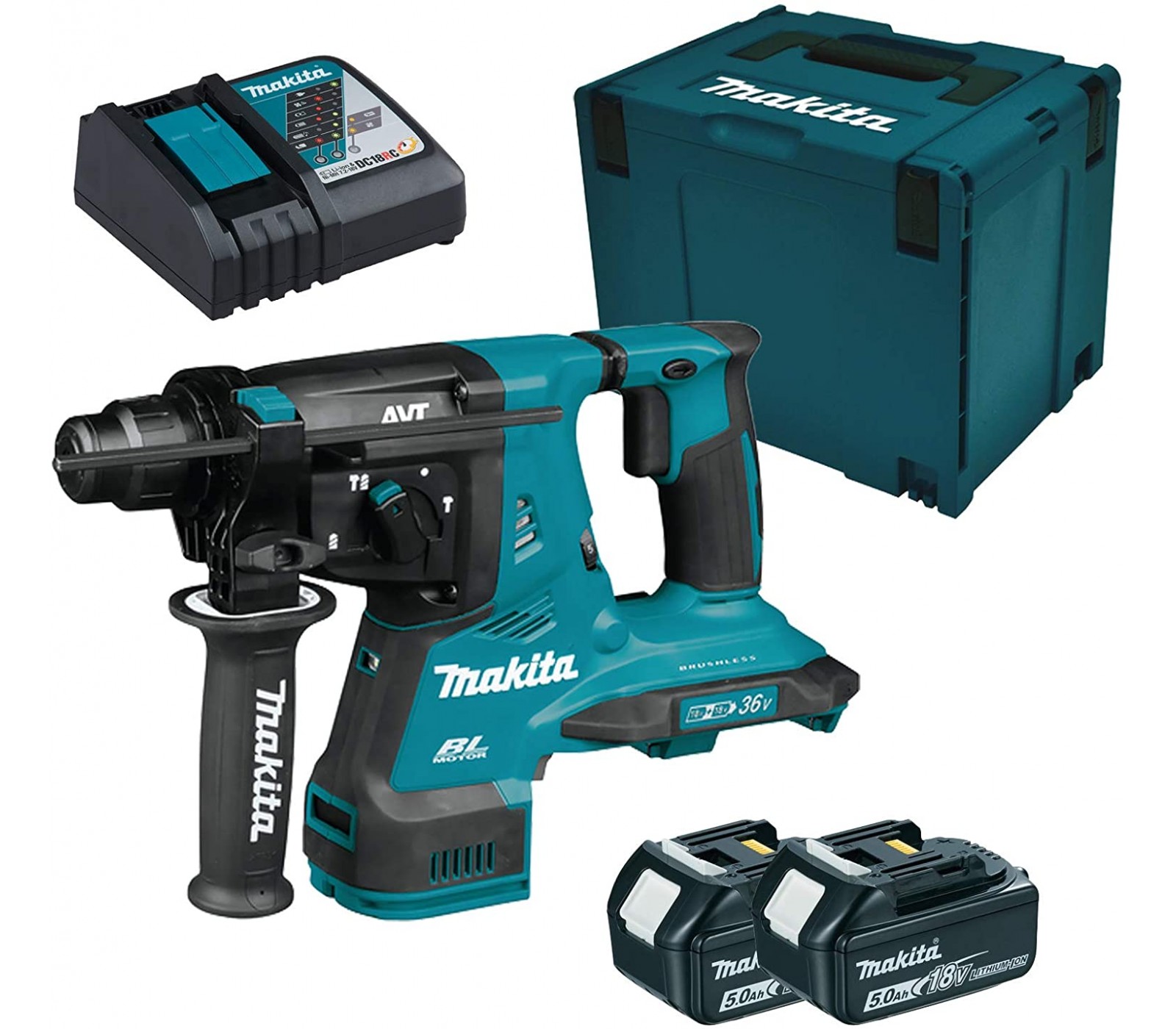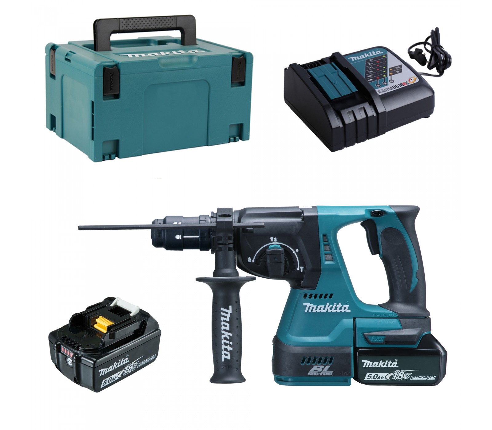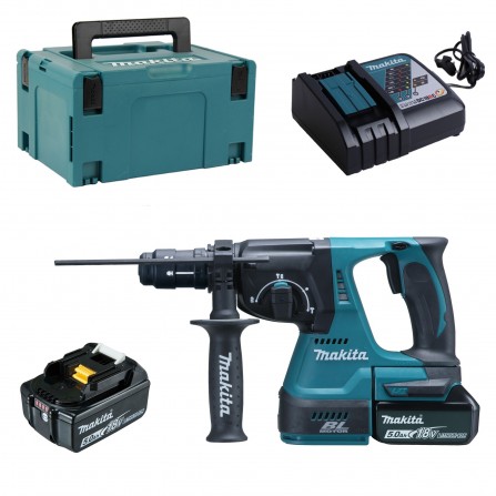 Bezvada rotējošais āmurs DHR243RTJ komplekts, 18 V, SDS-Plus, 2 x 5 Ah, lādētājs + maciņš