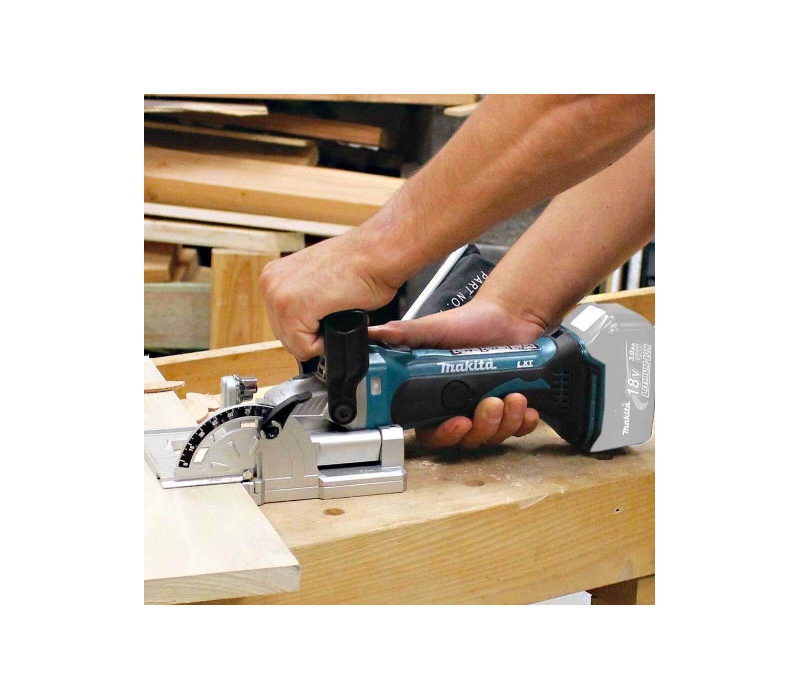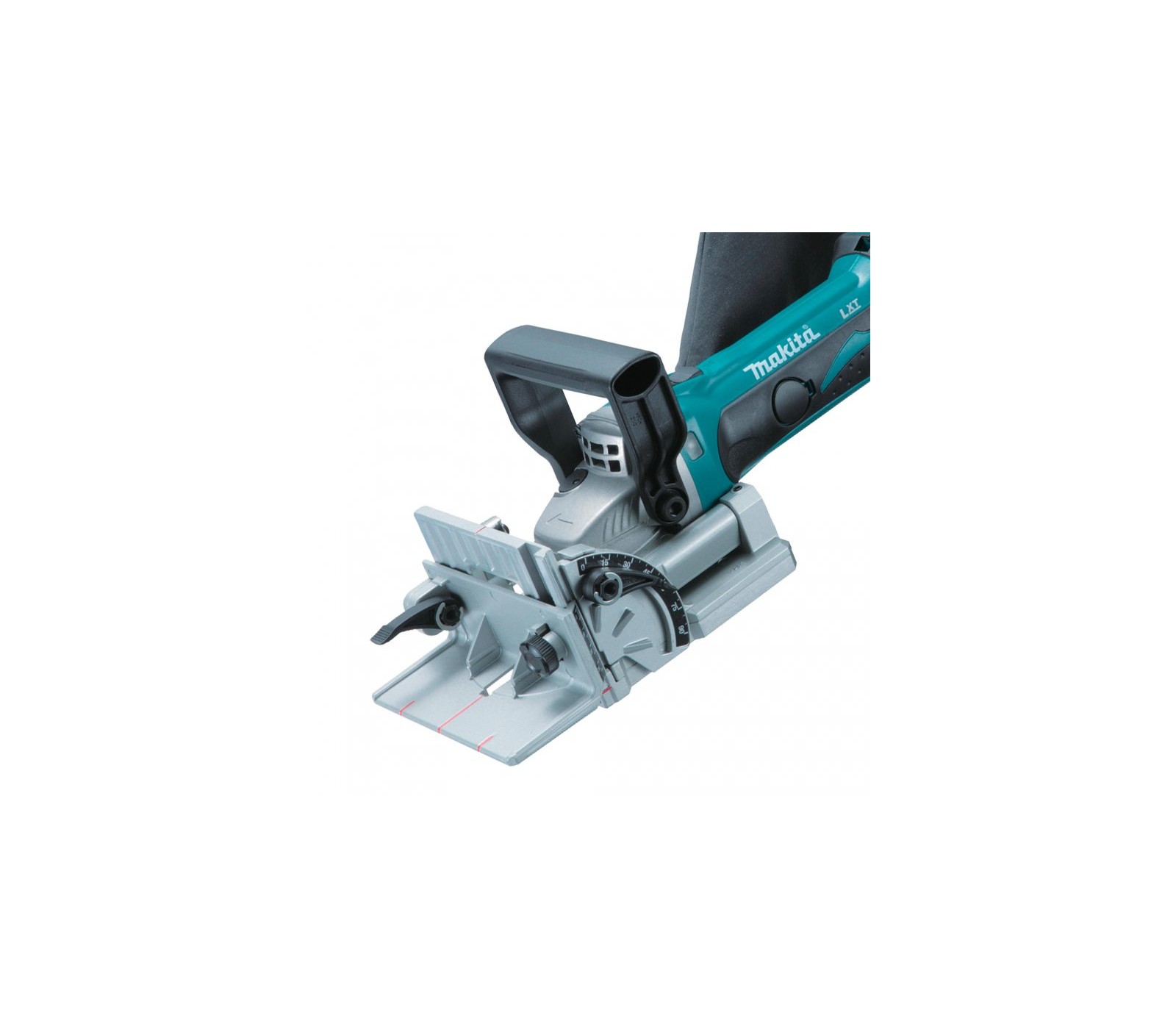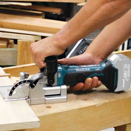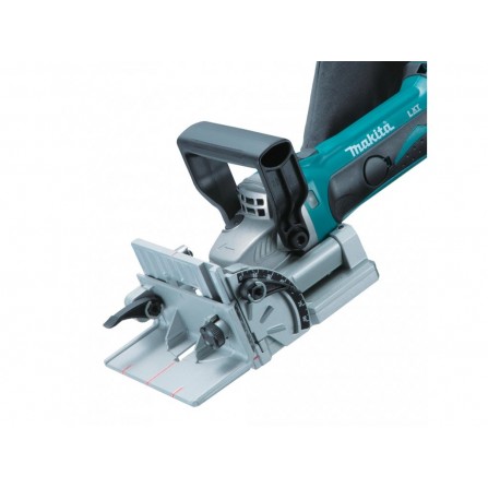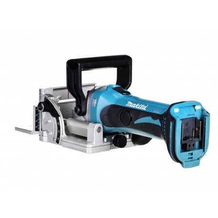 Makita DPJ180Z – 18V LXT® bezvadu frēzmašīna ar 6 dziļuma iestatījumiem. Regulējams leņķa vadotne (bloķējama 0°, 45°, 90°). Elektroniskā pārslodzes aizsardzība, putekļu maisiņš. Maks. griešanas dziļums: 20 mm. Svars ar akumulatoru ~3 kg. Bez akumulatora un lādētāja.