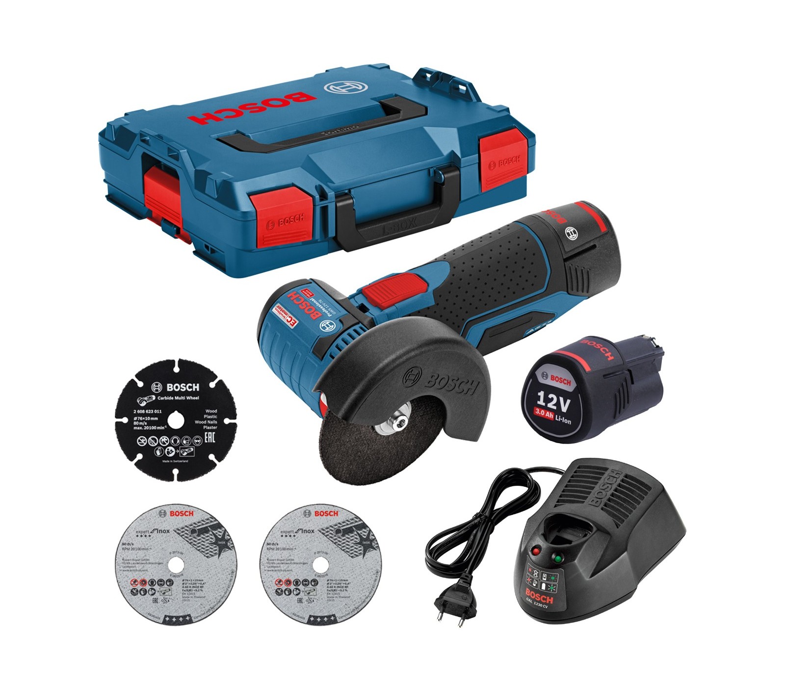 Akumulatora leņķa slīpmašīna Bosch GWS 12V-76 komplekts, 12 V, 2 x 3 Ah, lādētājs, korpuss + 3 diski