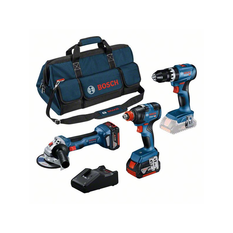 Bosch akumulatora instrumentu komplekts: GSB 18V-45 + GWS 18V-7 + GDX 18V-200