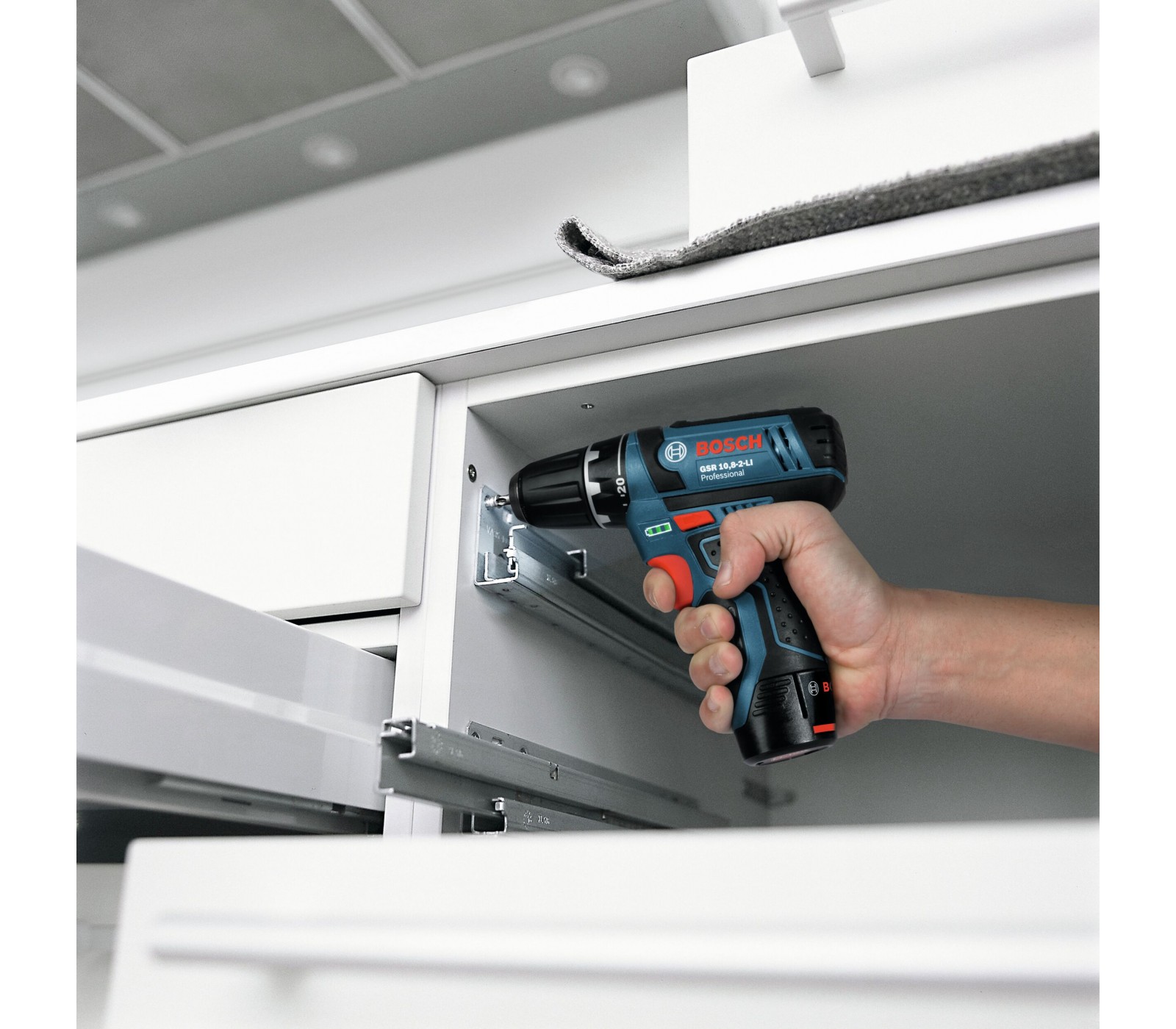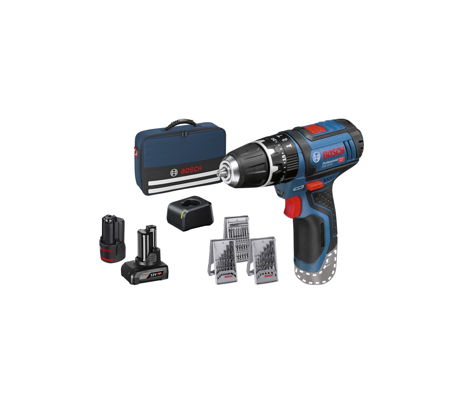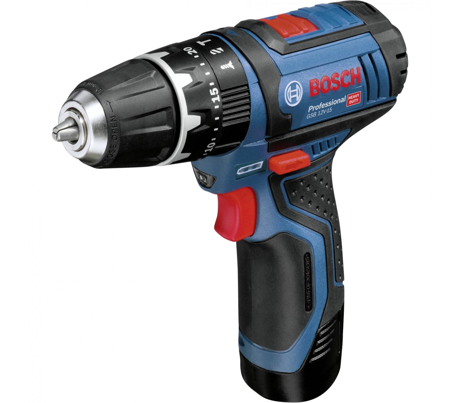 Bosch GSB 12V-15 bezvadu trieciena draivera komplekts, 12 V, 1 x 4 Ah, 1 x 2 Ah, lādētājs, piederumi + soma