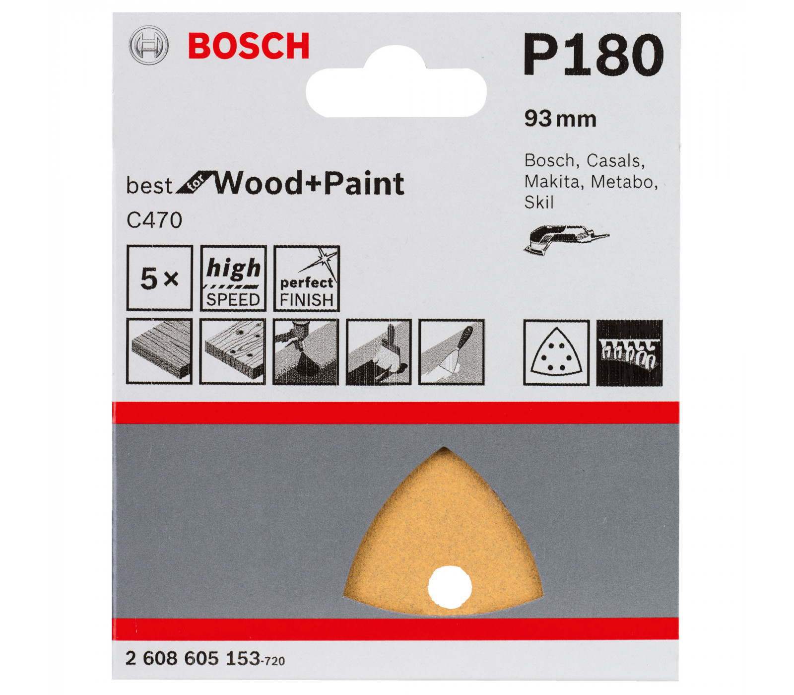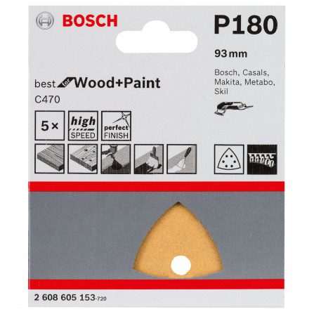 Bosch trīsstūrveida slīpēšanas papīrs C470, 93 mm, 180 smiltis, 5 gab.