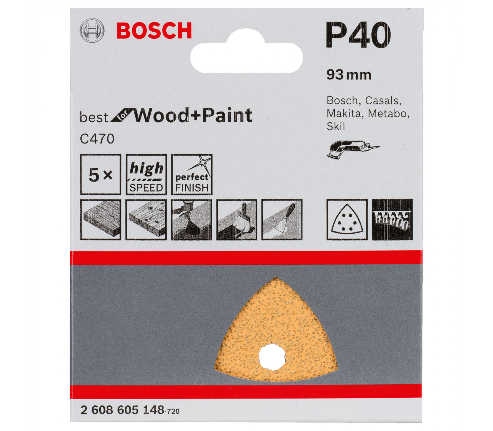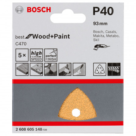 Bosch trīsstūrveida slīpēšanas papīrs C470, 93 mm, 40 smiltis, 5 gab.