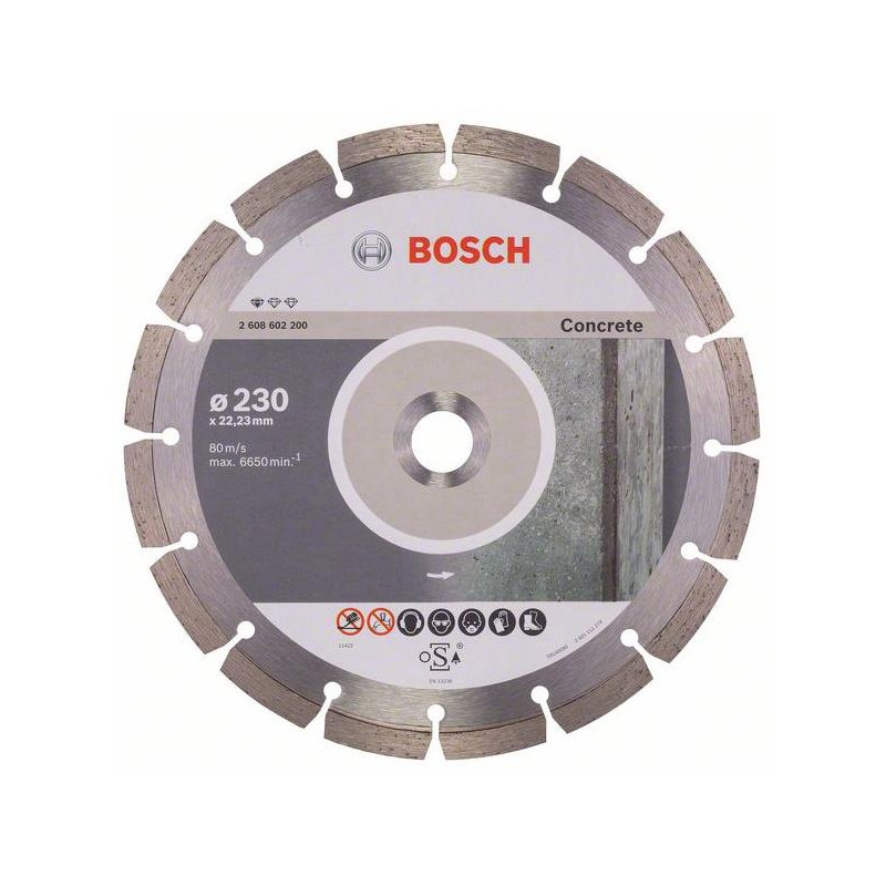 Zīmols - Bosch. Artikuls- 2608602200. Diametrs- 230 mm. Iekšējā cauruma diametrs ir 22,23 mm. Biezums - 2,3 mm. Svars - 0,620 kg. Dimanta diska tips- Segmentēts. Apstrādātais materiāls - Betons. Piemērots griešanai - Sauss. Vienības iepakojumā- 1. Segmenta augstums- 10 mm. Maksimālais ātrums minūtē - 6650 apgr./min. Pļaušanas ātrums - 80 m/s. Piemērots instrumentiem - Leņķa slīpmašīnas. Papildus informācija - Maksimālais ātrums minūtē: 6650 apgr./min. Segmenta augstums: 10 mm. Piemērots griešanai: Sauss. Svars: 0,620 kg.