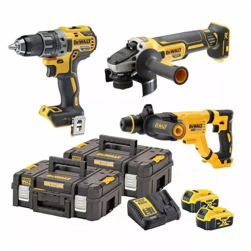 Akumulatoru instrumentu komplekts DeWALT DCK327P2T – Šis 18V komplekts ietver bezsuku urbjmašīnu skrūvgriezi DCD791, rotācijas āmuru DCH263 un slīpmašīnu DCG405 ar 2x 5,0 Ah akumulatoriem. Ideāli piemērots būvniecībai, renovācijai un metāla vai mūra darbiem ar daudzpusīgu jaudu un mobilitāti.