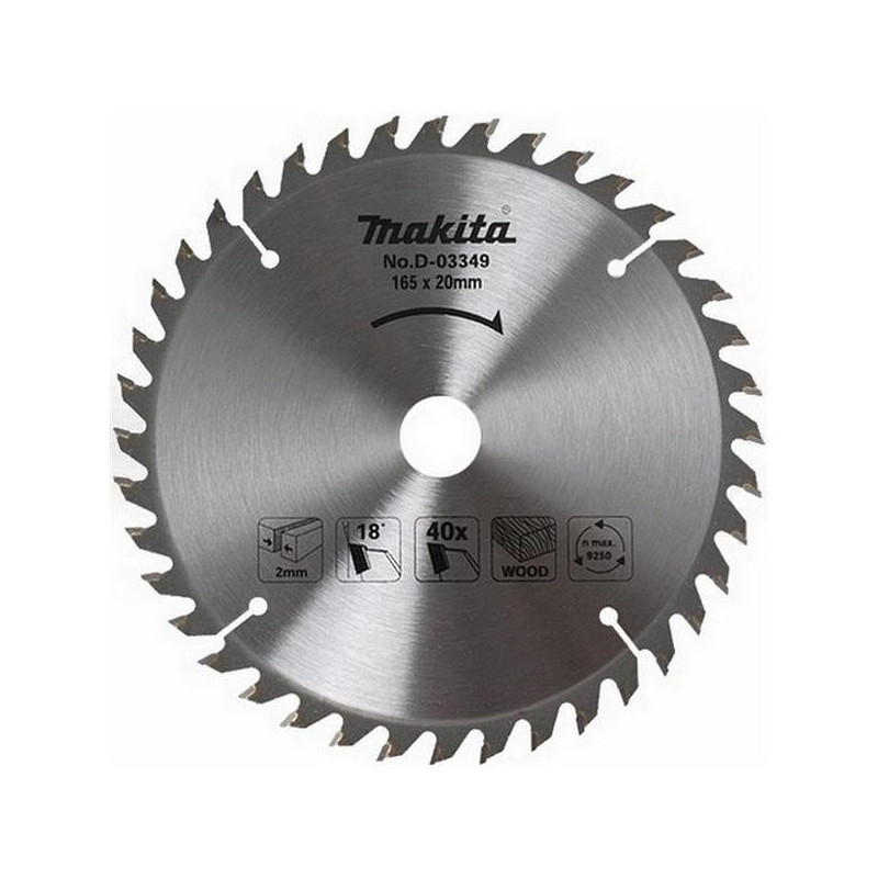 Zīmols - Makita. Artikuls- D-03349. Diametrs - 165 mm. Iekšējā cauruma diametrs ir 20 mm. Biezums - 2 mm. Svars - 0,257 kg. Materiāls - Metāls. Zobu skaits - 40. Zobu leņķis - 18 °. Maksimālais ātrums minūtē - 9250 apgr./min. Griezuma biezums - 2 - 2mm. Piemērota griešana - sausa. Ar gredzenu - Nē. Vienības iepakojumā- 1. Garantija- 24 mēneši. Papildus informācija - Zobu leņķis: 18°. Maksimālais ātrums minūtē: 9250 apgr./min. Svars: 0,257 kg. Piemērots modeļiem: 5603R 5604R. Apstrādātais materiāls - Koks.