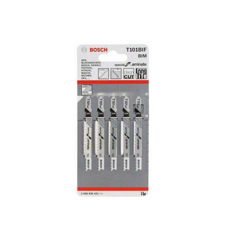 Zīmols - Bosch. Pants- 2608636431. Garums - 83 mm. Darba daļas garums ir 59 mm. Zobu solis - 1,7 - 1,7 mm. Apstrādātais materiāls - Koks, Lamināts. Griezuma biezums - 1,5 - 15mm. Piemērota griešana - sausa. Vienības iepakojumā - 5. Garantija - 24 mēneši. Papildus informācija - Garums: 83 mm. Darbstacijas garums: 59 mm. Zobu augstums: 1,7 mm. Plāksnes biezums: 1,5 - 15 mm. Piemērots griešanai: sausa virsma.
