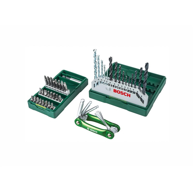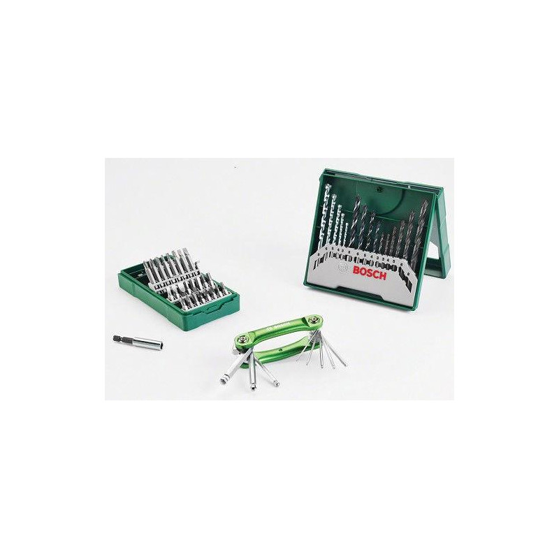 Zīmols - Bosch. Komplektā- -5gb Metāla urbji Ø 3/4/5/6/8 mm-5gab Akmens urbji Ø 3/4/5/6/8 mm-5gab Koka urbji Ø 3/ 4/5/ 6/ 8 mm -16 skrūvju uzgaļi, L = 25 mm, PH 1/2/3, PZ 1/2/3, SL 4,5/5,5/8,0, HEX 4/5/6, T 15/20 /25 /30-8 skrūvju uzgaļi, L = 50 mm, PH 1/2/3, SL 4.5/5.5, T 15/20/25-1 universāls turētājs, magnētiskais-1gab sešstūra atslēgu komplekts. Detaļu skaits komplektā - 40. Garantija - 24 mēneši. Papildus informācija - Svars: 0,88 kg. Izmēri: 28,3 x 26,3 x 29 cm.