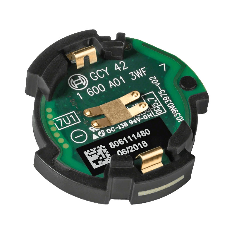 Bosch GCY 42 Bluetooth modulis savieno saderīgos Bosch Professional instrumentus ar viedtālruni vai planšetdatoru, izmantojot Bluetooth 4.0 Low Energy. Nodrošina datu pārsūtīšanu, parametru iestatīšanu un režīmu kontroli. Kompakts (30 x 7 mm), viegls (0,01 kg), darbināms ar CR2032 pogbateriju. Ideāli piemērots instrumentu uzraudzībai un pielāgošanai Bosch Toolbox lietotnē.