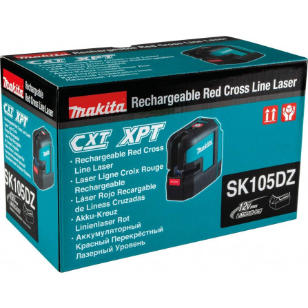 Makita SK105DZ ir 12V CXT® akumulatora lāzera līmeņrādis ar horizontālu un vertikālu līniju (atsevišķi vai kopā). Precizitāte ±0,3 mm/m, darbības attālums līdz 25 m (80 m ar uztvērēju). IP54 putekļu un ūdens aizsardzība. Līdz 40 h ar 4,0 Ah akumulatoru. Bez akumulatora un lādētāja.