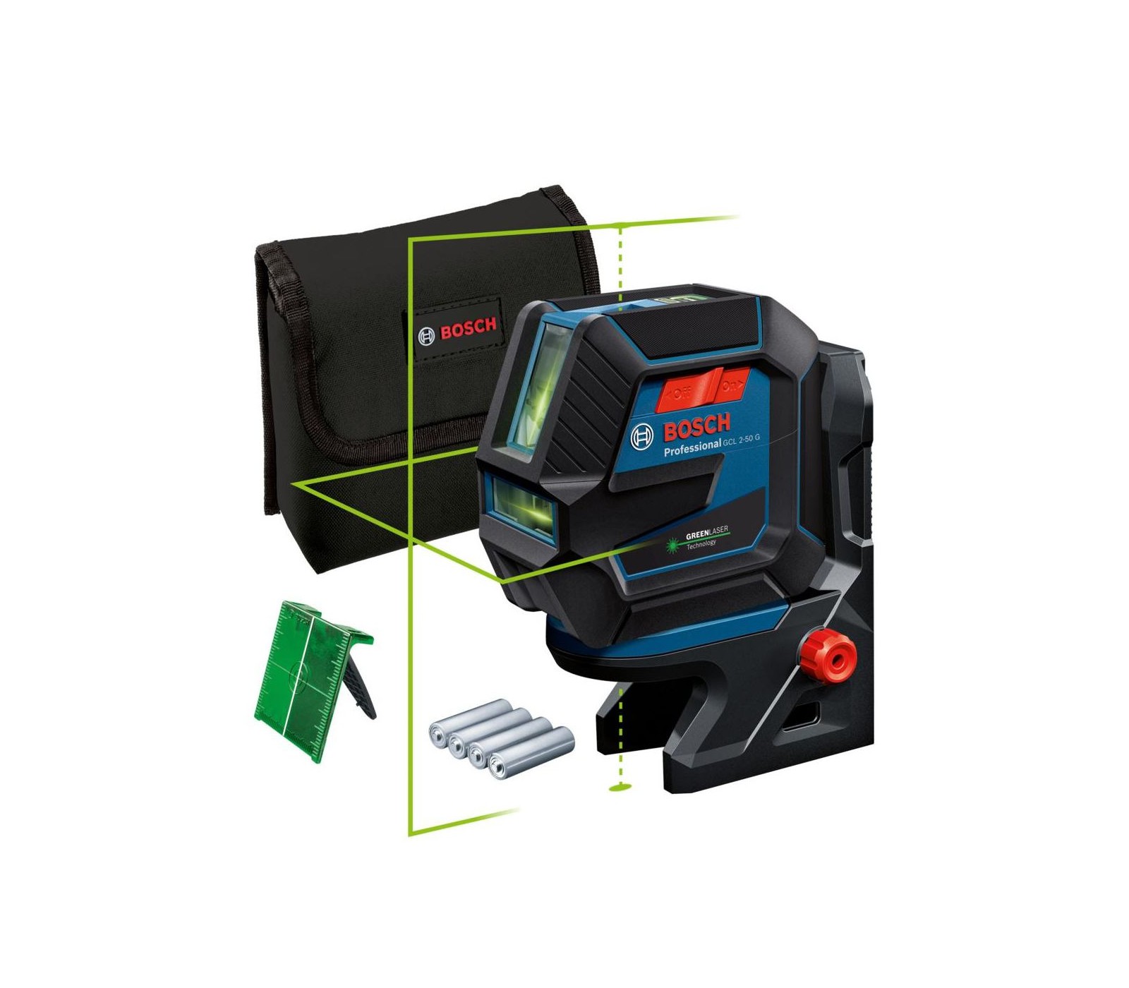 Bosch GCL 2-50 G ir bezvadu lāzera līmeņrādis ar zaļām līnijām un punktiem, kas nodrošina lielāku redzamību. Izturīgs gumijas korpuss ar IP64 aizsardzību pret putekļiem un ūdeni. Vienkārša vadība ar vienu pogu. Lieliski piemērots plauktu montāžai, flīzēšanai vai karkasa līmeņošanai. Darba attālums līdz 15 m, ar uztvērēju – līdz 50 m. Pašlīmeņojas 4 sekundēs, darbojas ar 4 AA baterijām, svars – tikai 0,58 kg.