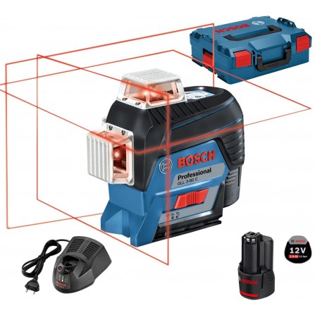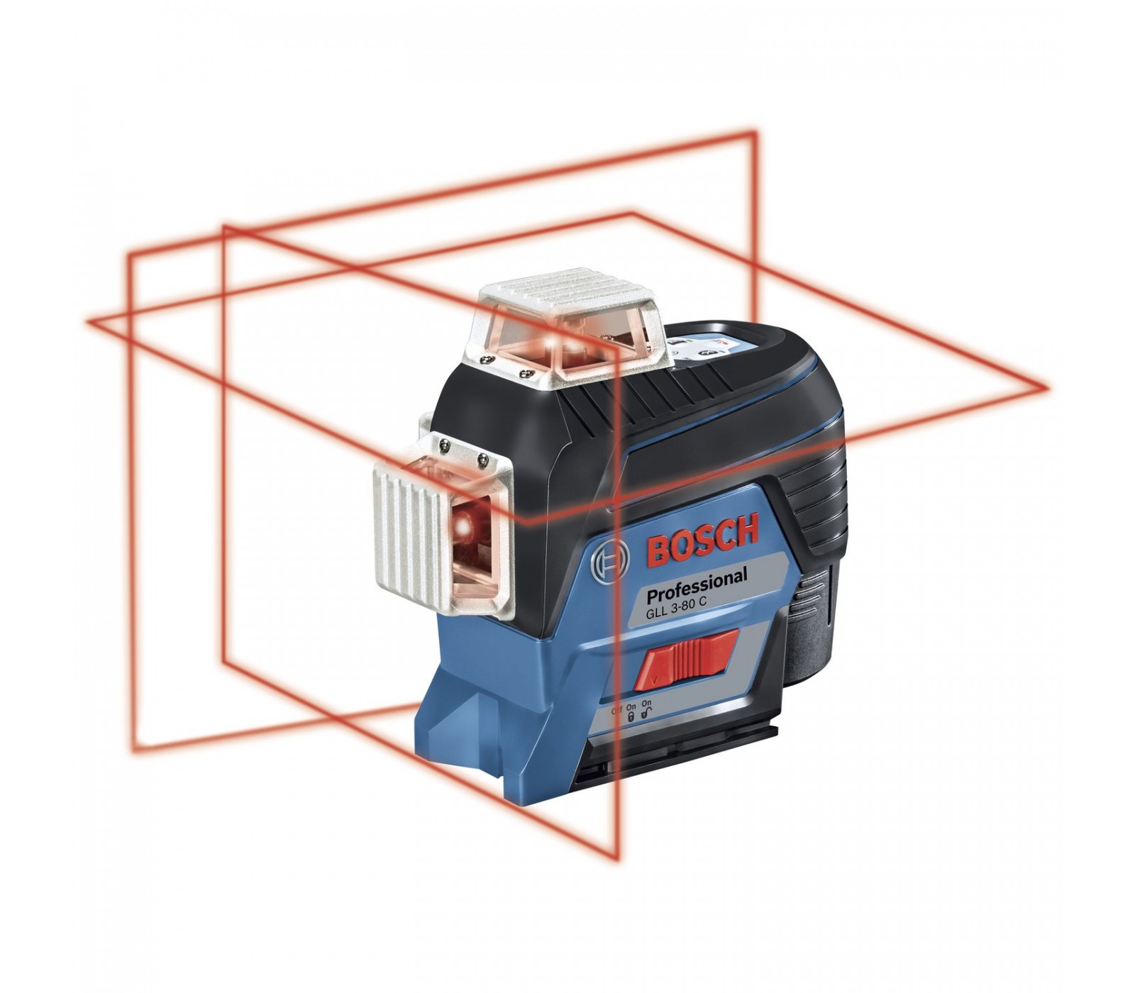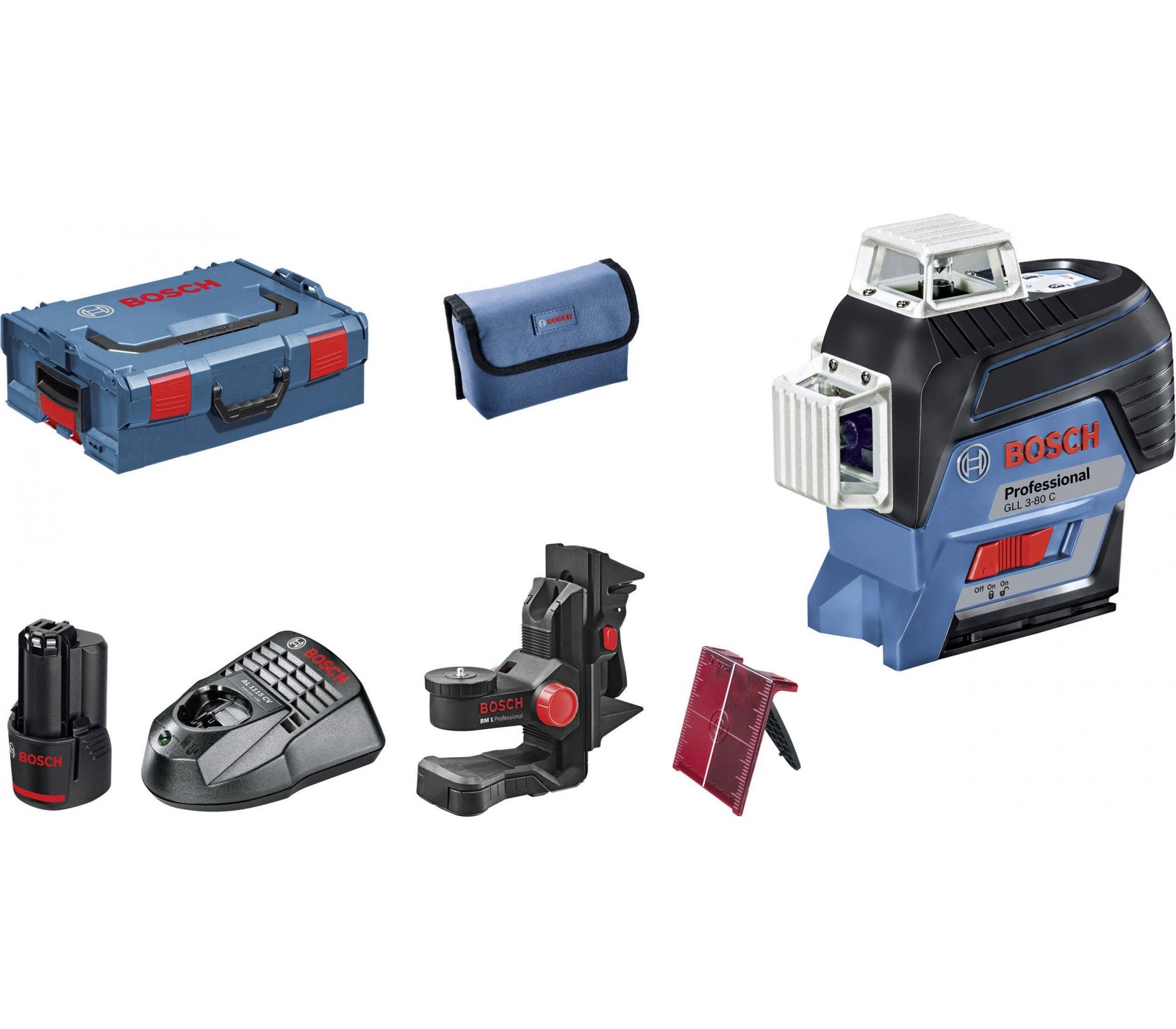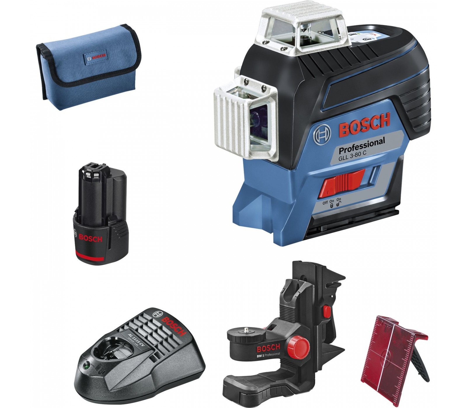 Bezvada lineārais līmenis Bosch GLL 3-80 C (0601063R02) komplekts, 12 V, 2 Ah, lādētājs, maciņš + piederumi