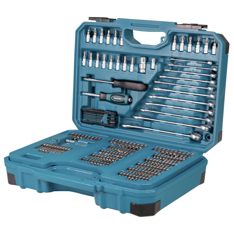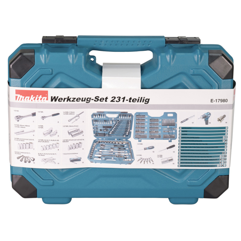 Makita E-17980 uzgriežņu atslēga, skrūvgriezis un galviņu komplekts (231 gab.)