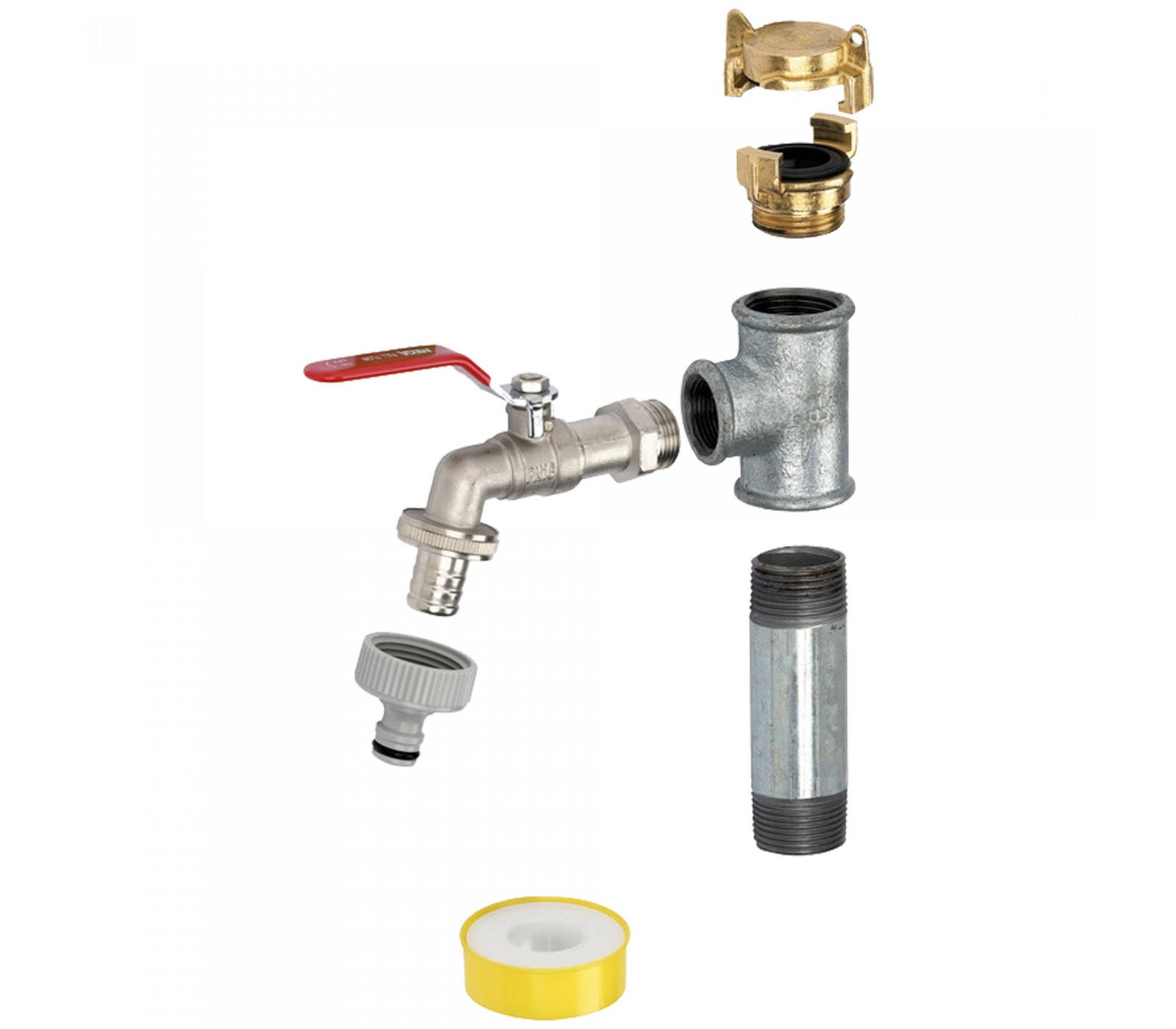 - Cinkots caurules nipelis; 1 collu vītne, 100 mm; cinkota tee; 1 collu x 3/4 x 1 collu vītne; misiņa lodveida iztukšošanas jaucējkrāns; jaucējkrāna savienotājs; misiņa savienojums; ātras darbības savienojums; blīvējuma sloksne, 12 gadi