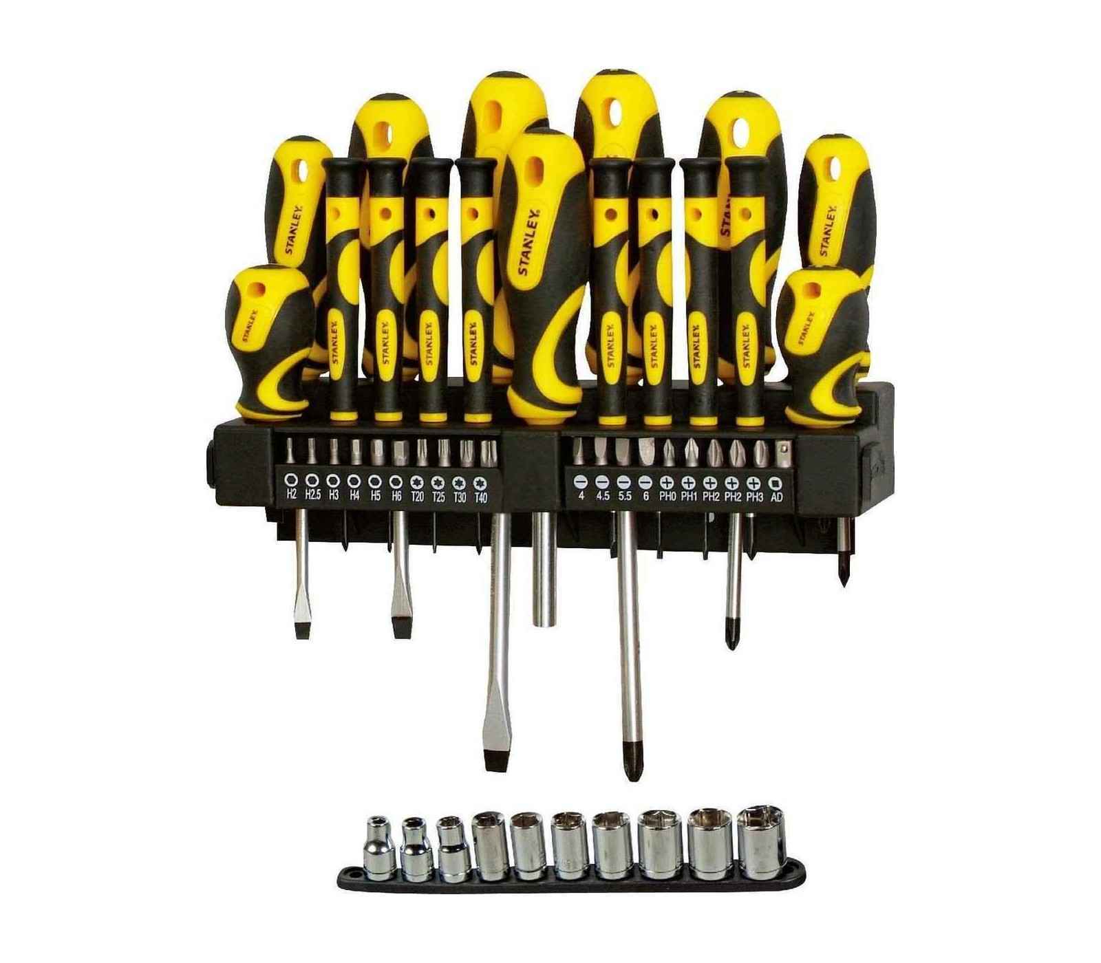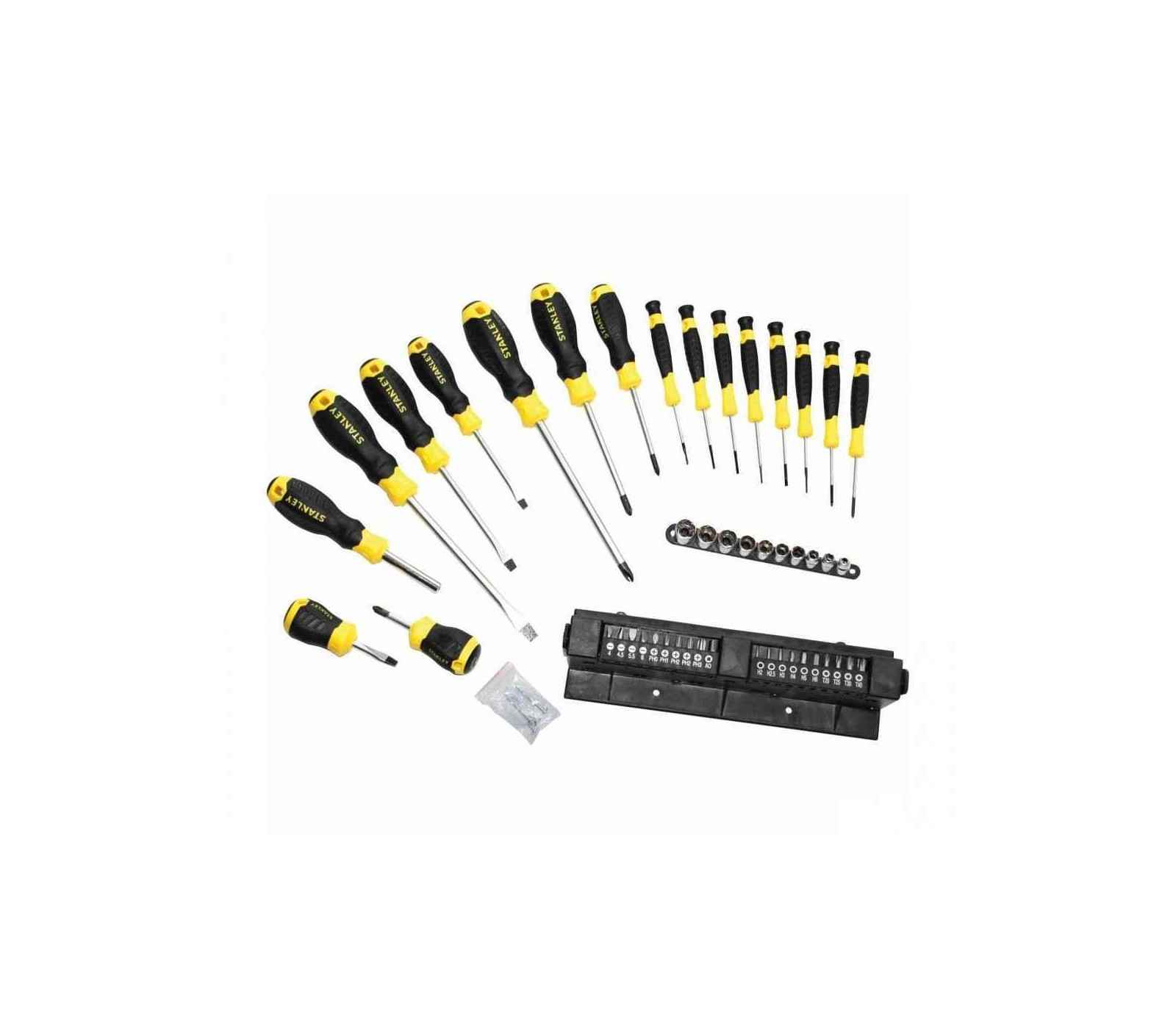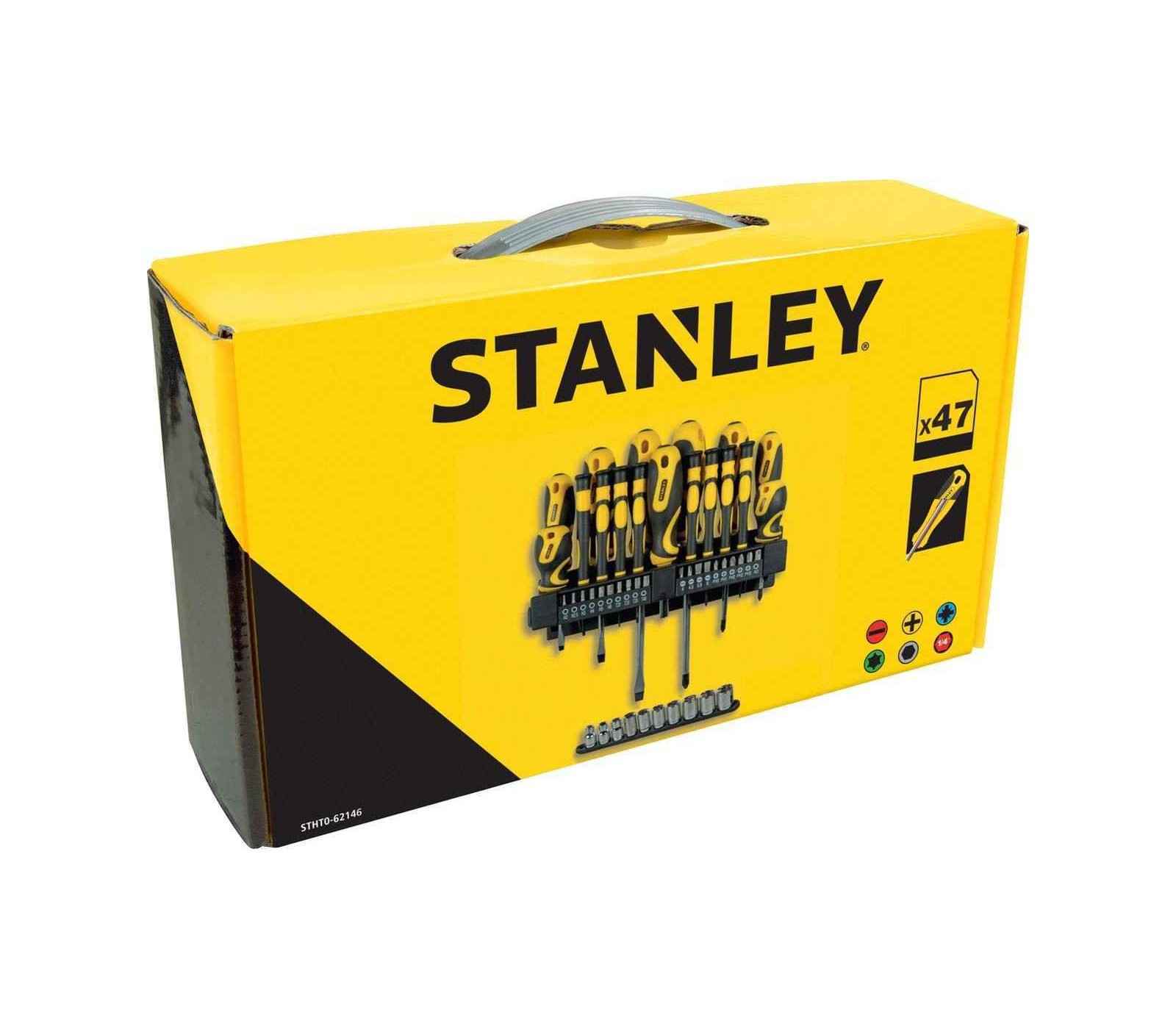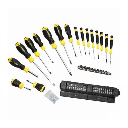 Stanley skrūvgriežu komplekts (STHT0-62146), 47 gabali ir paredzēts augstai veiktspējai un izturībai. Komplekts ir aprīkots ar lieliem, mīkstiem rokturiem, kas nodrošina augstu griezes momentu un izcilu komfortu lietošanas laikā. Formēta roktura un kāta savienojums nodrošina drošu un nevainojamu satvērienu, padarot skrūvju griešanu vieglu. Izgatavoti no hroma vanādija tērauda, šie skrūvgrieži ir izturīgi un tiem ir sacietējušas melnas oksidētas gali, kas uzlabo to izturību un stiprumu. Šis komplekts ietver dažādus skrūvgriežus un bitus, padarot to piemērotu dažādiem darbiem.