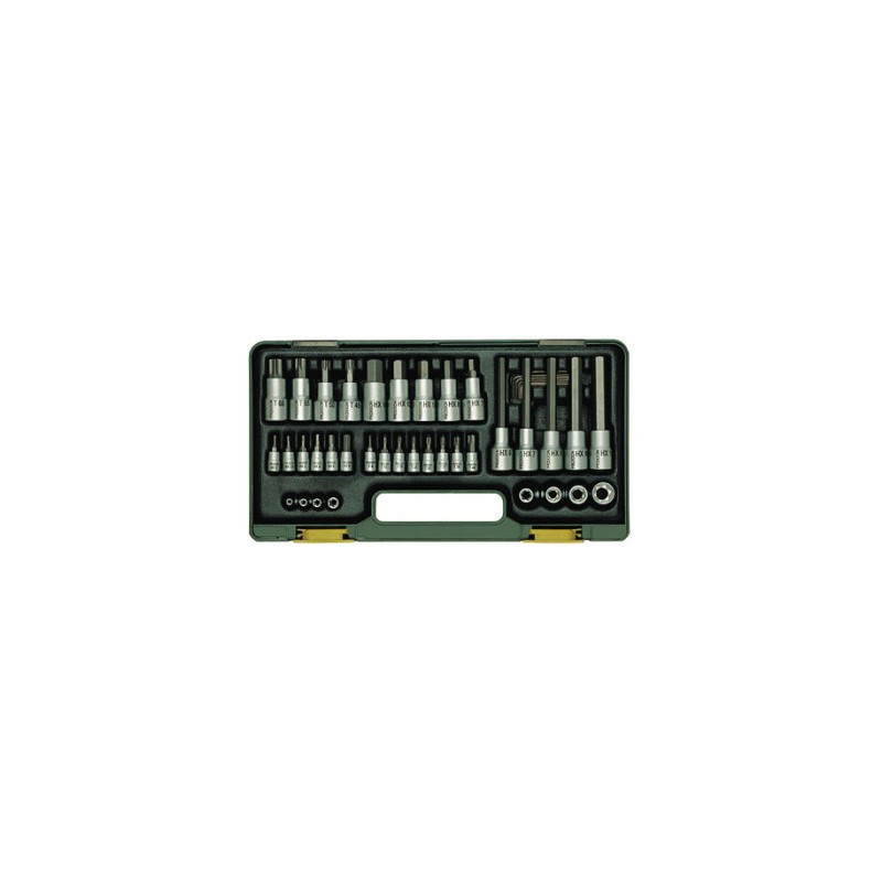 - Komplektā ir 42 dažādas uzmavas, kas nodrošina to, ka ir pieejami rīki dažādām vajadzībām.