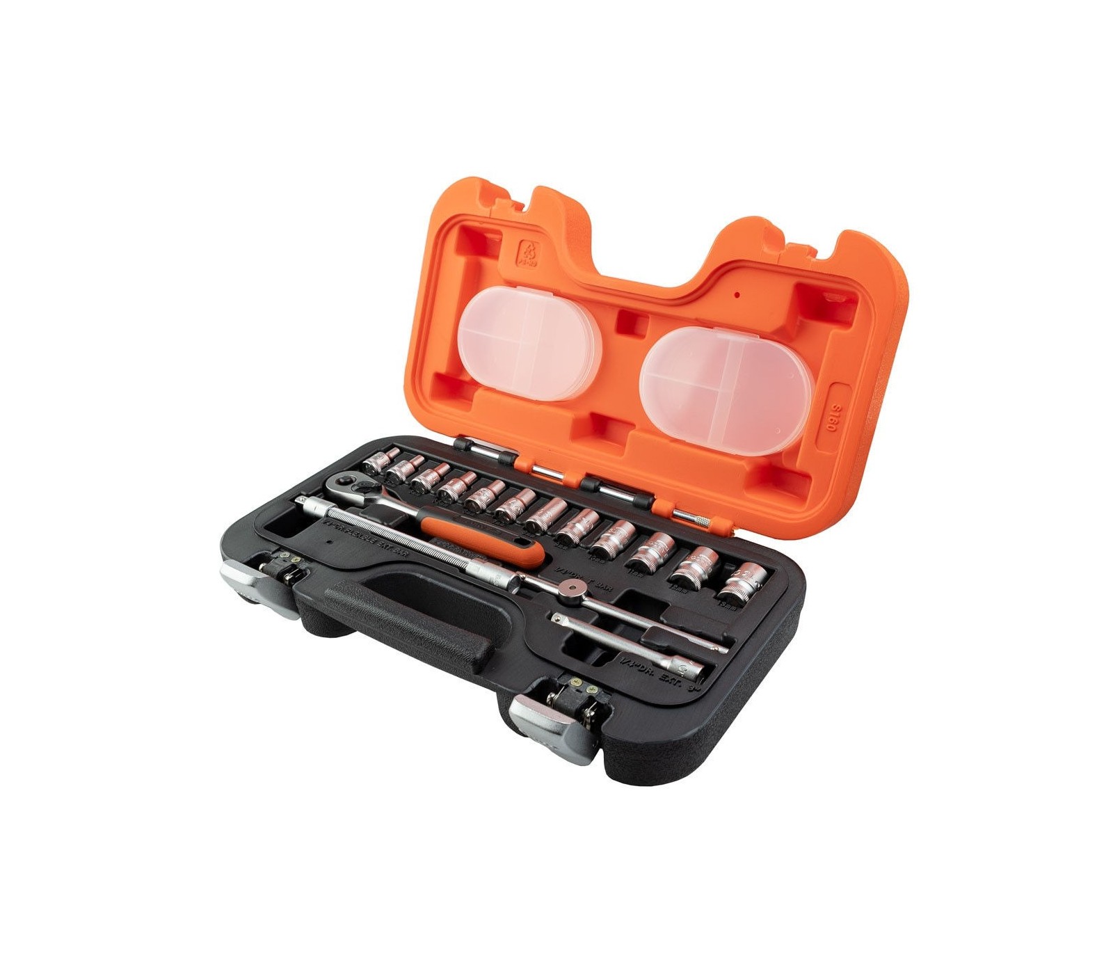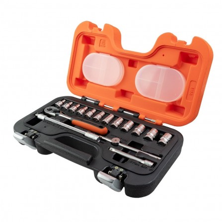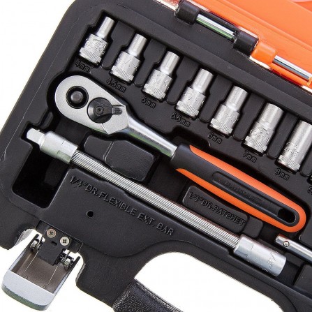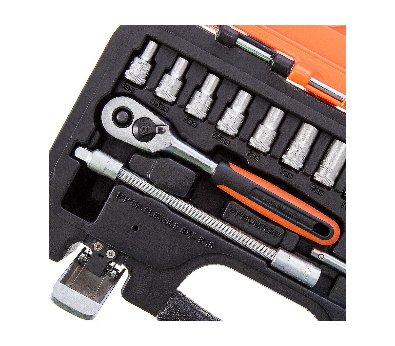 12 x 1/4 collu sešstūra galva 4–13 mm1 x 1/4 collu uzgrieznis, ātri nolaižams, 60 zobu / 6 ° darbības leņķis, 1 x 1/4 collu bīdāmā tīte, 100 mm / 4 ''1 x 1/4'' ""Pagarinājuma savienotājs, 75 mm / 3"" 1 x 1/4"" elastīgs pagarinājums savienotājs, 150 mm / 6''.